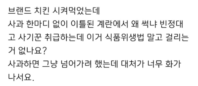 이어 "검색해보니 신고해봤자 위생 점검하고 끝낸다고는 그 정도로는 분이 안 풀린다. 식품위생법 말고 신고하는 방법 없냐"라고 조언을 구했습니다.
