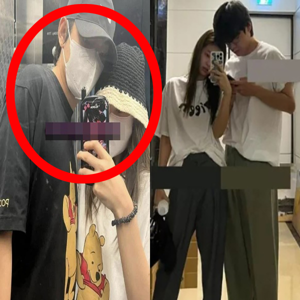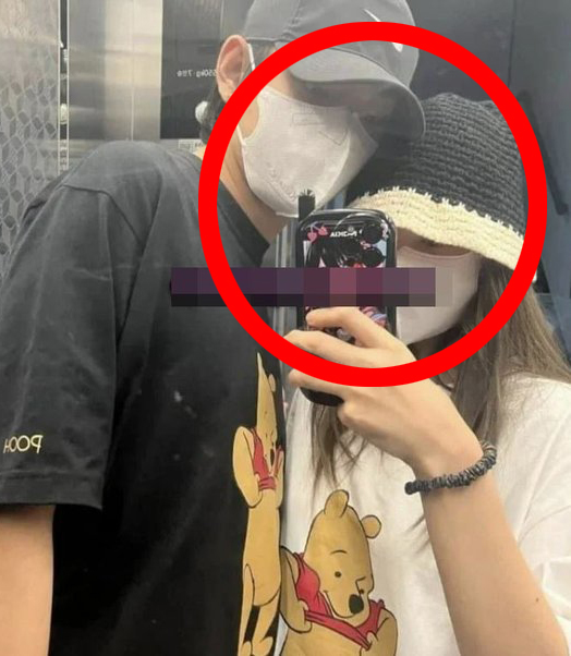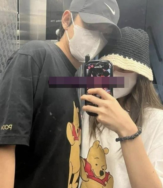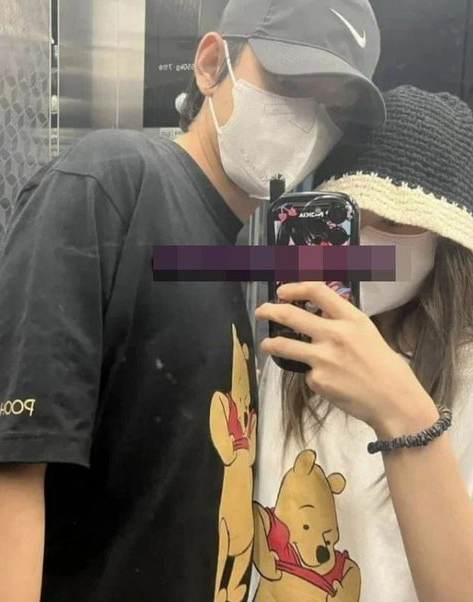 공개된 사진 속에는 뷔와 제니로 추정되는 남녀가 곰돌이 푸 캐릭터가 그려진 의상을 입은 채 엘리베이터 안에서 고개를 맞댄 채 셀카를 촬영하고 있는 모습이었습니다.