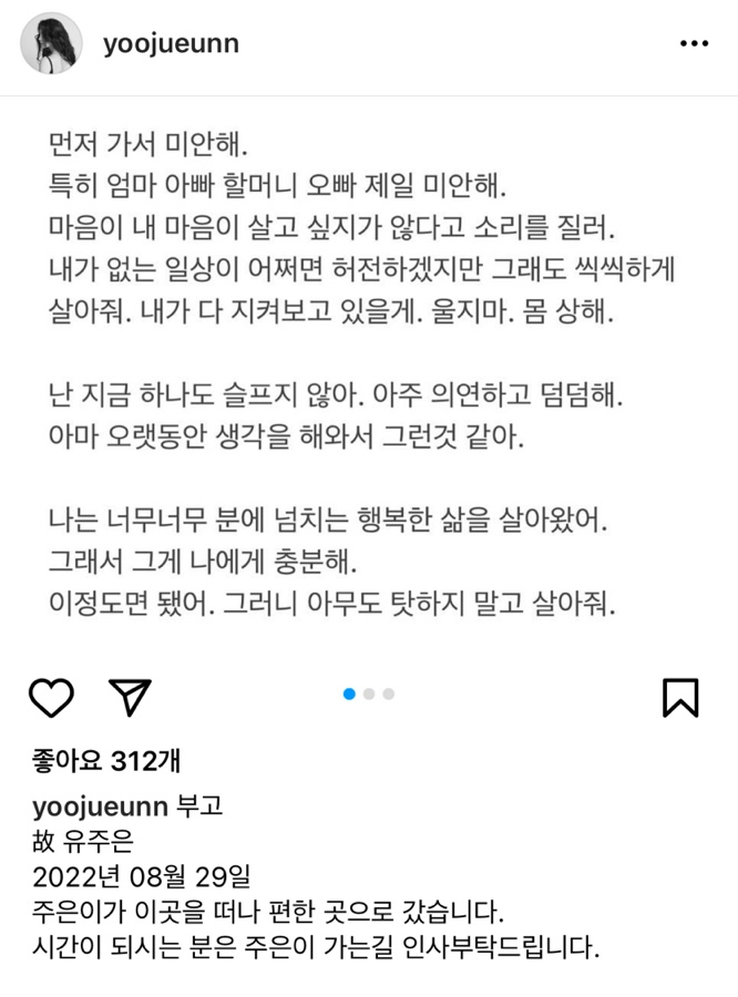 유한 씨는 유주은의 유서를 공개하며 "2022년 8월 29일 주은이가 이곳을 떠나 편한 곳으로 갔습니다. 시간이 되지는 분은 주은이 가는 길 인사 부탁드립니다. 주은이의 마지막 부탁으로 이렇게 글을 올립니다"라고 전했습니다.