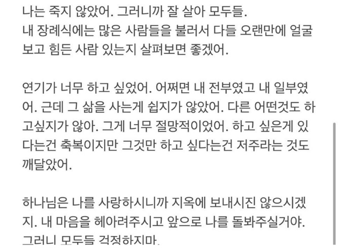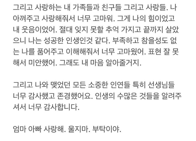 유주은의 유서에는 '먼저 가서 미안해. 특히 엄마 아빠 할머니 오빠 제일 미안해. 마음이 내 마임이 살고 싶지가 않다고 소리를 질러. 내가 없는 일상이 어쩌면 허전하겠지만 그래도 씩씩하게 살아줘. 다 지켜보고 있을게. 울지 마 몸 상해'라는 가족을 걱정하는 내용이 담겨 있어 마음을 더 아프게 했습니다.