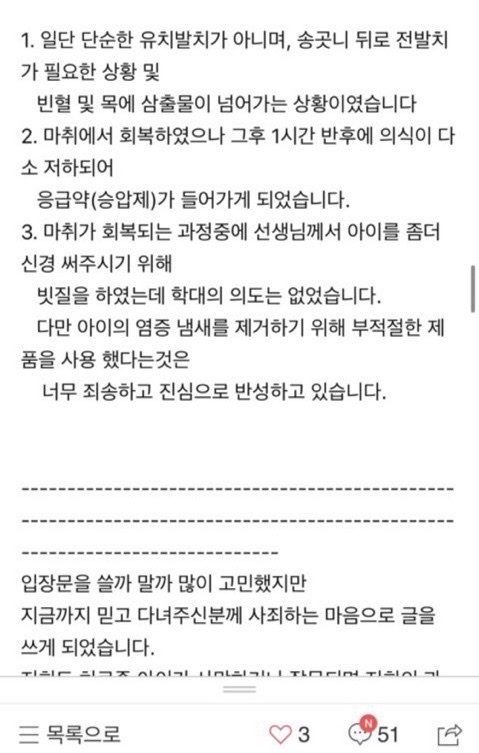 논란이 커지자 광주 동물병원 원장은 4일 온라인 커뮤니티 '강사모(강아지를 사랑하는 모임)'에 "단순한 유치 발치가 아니며 송곳니 뒤로 전 발치가 필요한 상황 및 목에 삼출물이 넘어가는 상황이었다"라며 "마취에서 회복하였으나 1시간 반 후에 의식이 다소 저하되어 응급약(승압제)이 들어가게 됐다"고 글을 올렸습니다.