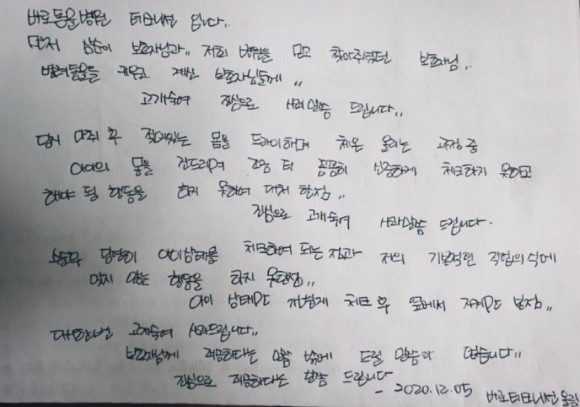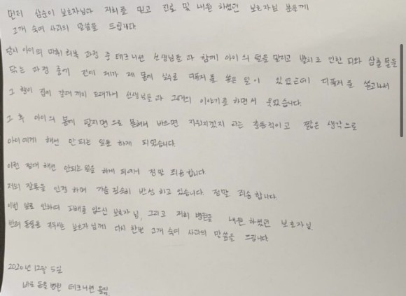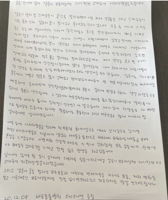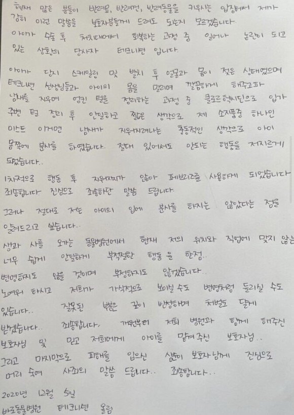 그러면서 "(수의테크니션들은)강아지가 마취에서 회복되는 과정에서 좀 더 신경 써주기 위해 빗질을 하였는데 학대의 의도가 전혀 없었다"고 밝혔습니다. 또 원장은 "아이의 염증 냄새를 제거하기 위해 부적절한 제품을 사용했다는 것은 너무 죄송하고 진심으로 반성하고 있다"고 덧붙였는데, 이에 누리꾼들은 분노하며 "그럼 CCTV에 찍힌 웃는 모습은 뭐냐", "헛소리하지 마라", "이런 글을 해명이랍시고 올리냐"등의 논란이 계속되자 해당 입장문을 삭제하고 이튿날 자필 사과문을 게재했습니다.