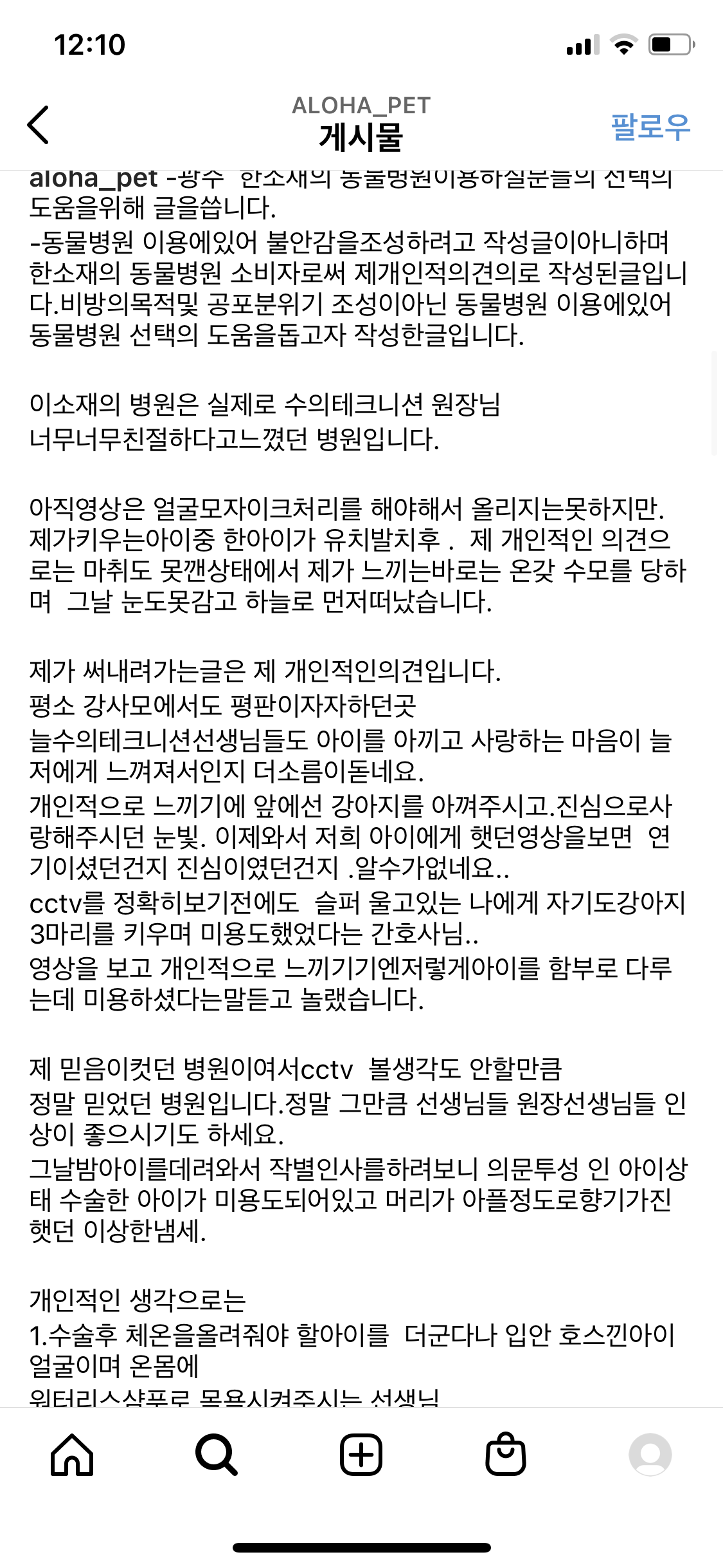 한편 이를 확인한 견주는 "보여주기 식의 사과라고 밖에 생각이 안 든다. 한바탕 병원에서 울며 소리친 그날도 제가 다녀간 이후 영업을 하시며 웃으면서 (다른 강아지들을) 반겨주셨다는 말을 들었다"며 "저는 듣지 못한 사과를 여기서 본다"고 분통해했습니다.