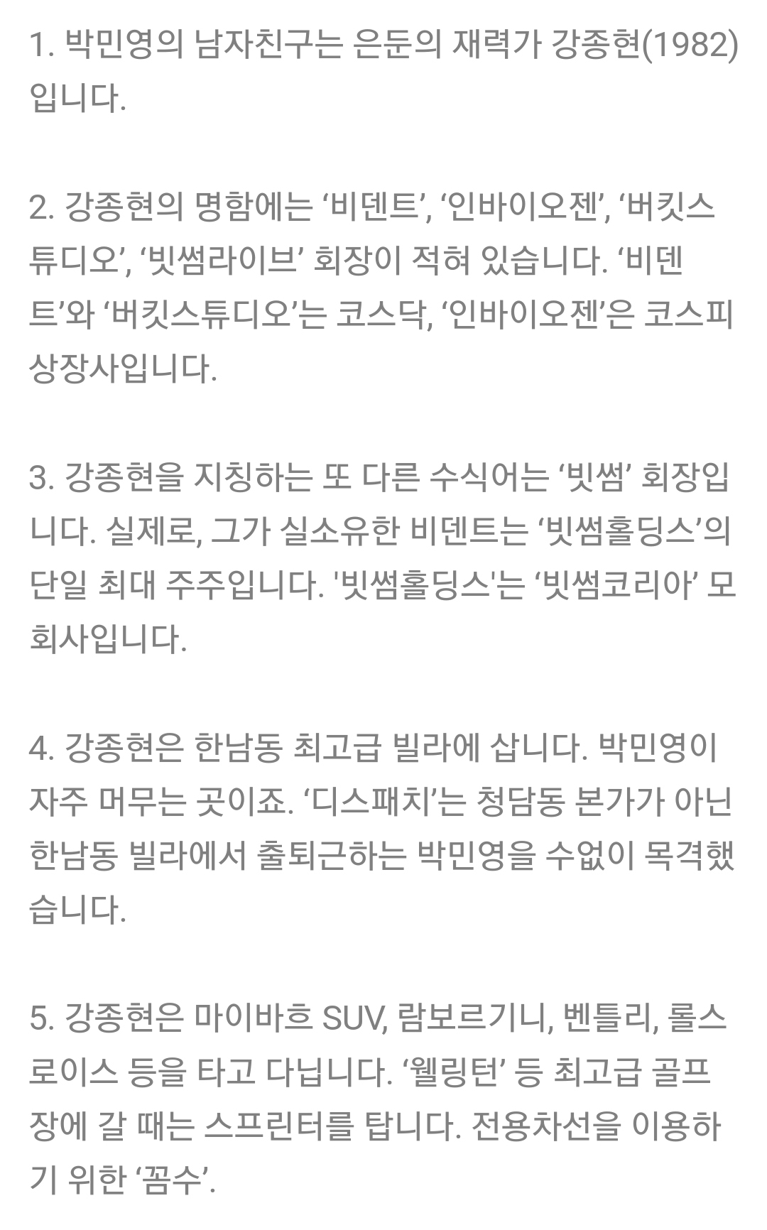 강종현은 디스패치를 통해 자신은 빗썸홀딩스의 회장이 아니라고 부인한 것으로 알려졌으며 박민영의 소속사 측은 이와 관련해 입장을 밝히지 않고 있습니다.