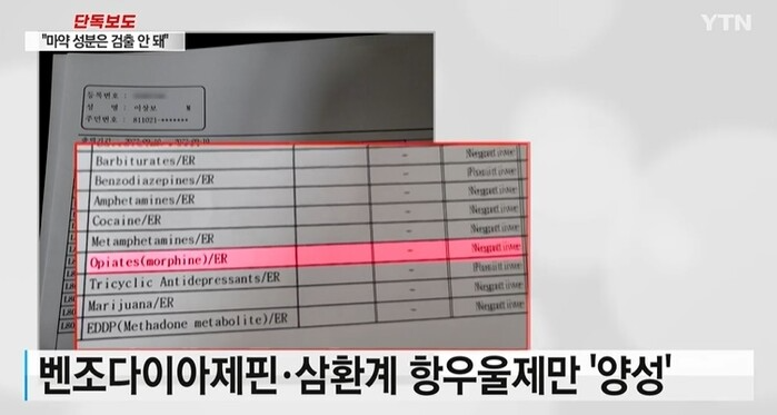 경찰은 체포 당시 간이 시약검사에서 '양성'반응이 나왔던 '모르핀' 성분이 검출되지 않았다고 설명했습니다. 또 소변과 모발에서 검출된 향정신성의약품 성분들도 그간 병원에서 처방받은 내용이 확인돼 마약을 투약했다고 볼 증거가 없다고 덧붙였습니다.