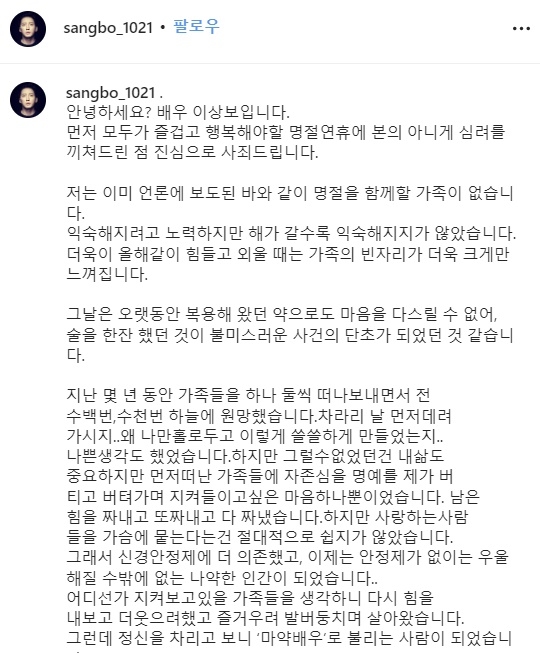 마약 투약 혐의로 긴급체포된 이상보는 우울증 약을 복용했을 뿐이라고 주장했습니다. 이상보는 지난 2009년 아버지가 돌아가신 뒤 어머니와 누나까지 사고로 운명하며 우울증이 심해졌다고 밝히며 "지난 2019년부터 항우울제와 신경안정제를 복용해왔다"며 마약류 양성 반응이 나온 것은 "우울증 약물에 포함된 소량의 마약 성분 때문"이라고 설명했습니다.