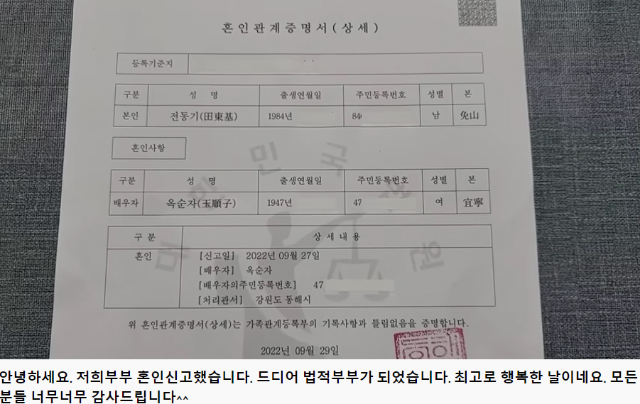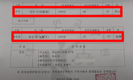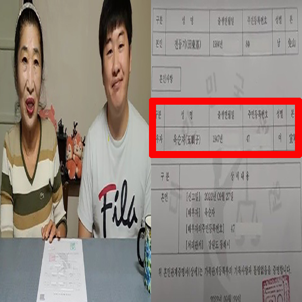 영상에 따르면 1947년생 75세의 부인 옥모씨와 1984년생 37세의 전 모 씨는 강원도 동해시에서 지난달 27일 법적 혼인신고를 마쳤습니다.