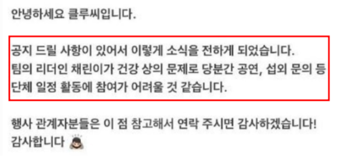 클루씨 리더 이채린이 암 투병 사실을 고백했습니다.
