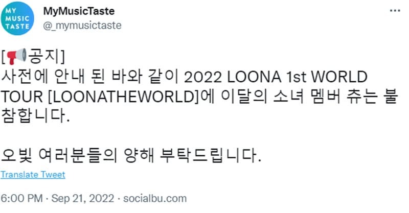 이후 K-POP 공연 플랫폼 기업 '마임뮤직테이스트'는 공식 트위터를 통해 츄의 불참 소식을 전해 팬들에게 실망을 안겼습니다.