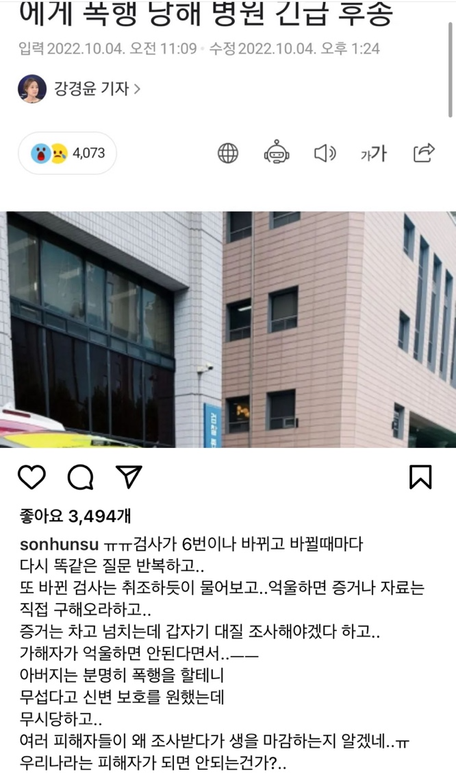 손헌수는 4일 자신의 인스타그램에 "검사가 6번이나 바뀌고 바뀔때마다 똑같은 질문 반복하고 또 바뀐 검사는 취조하듯이 물어보고 억울하면 증거나 자료는 직접 구해오라고 하고"라는 글과 함께 박수홍이 친부에게 폭행을 당해 응급실에 실려갔다는 내용의 기사를 캡처해 올렸습니다.