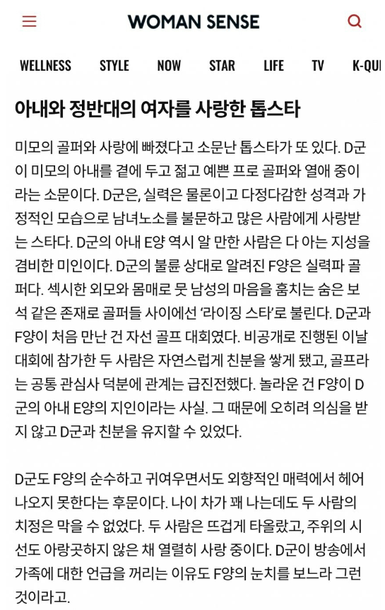 앞서 올해 초 한 매거진은 유부남 톱스타가 미모의 아내를 곁에 두고 젊은 예쁜 프로 골퍼와 열애 중이라고 보도했습니다.