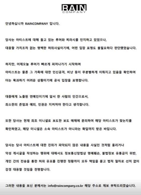이어 비 측은 "말도 안 되는 소리다. 루머 관련 공식 입장도 곧 정리해 발표할 예정"이라며 법적 대응을 시사하는 공식입장을 발표했습니다.