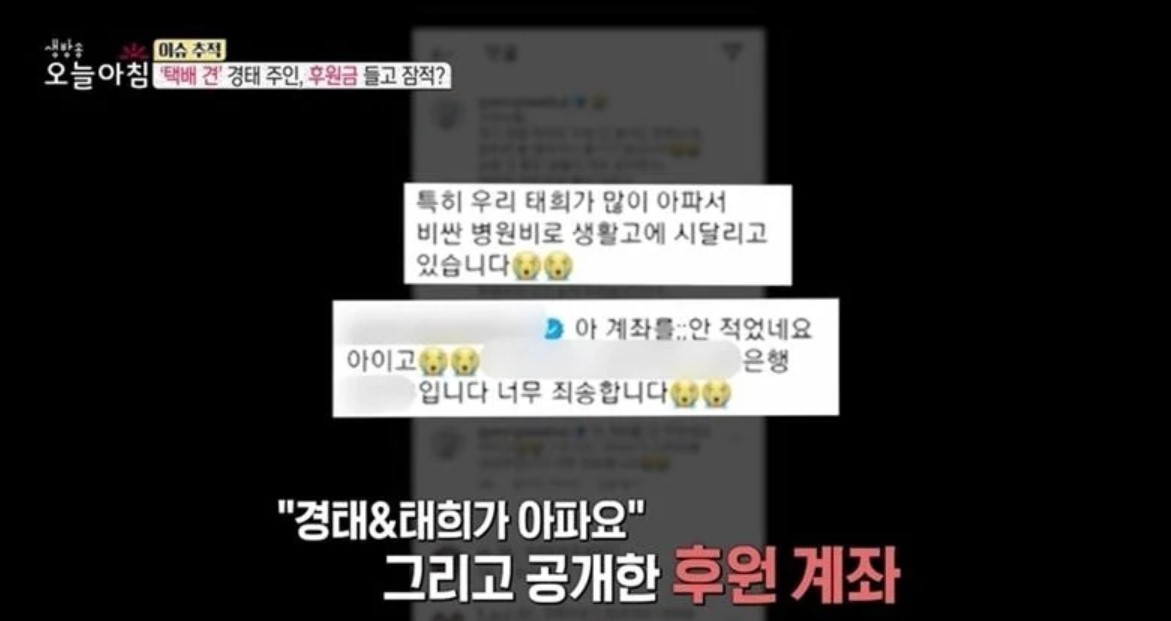 경태아부지 인스타그램 계정에는 지난 3월 '경태와 태희가 심장병에 걸렸는데 치료비가 없고 누군가 차사고를 내 택배 일도 할 수 없다'며 후원금을 요청하는 글이 올라왔고 해당 계정을 통해 이미 개인적으로 후원을 한 사람들에게 추가 입금을 부탁하는 메시지가 가거나 아픈 반려견을 치료할 돈이 없어 힘들다는 글이 여러 차례 게재되기도 했습니다.