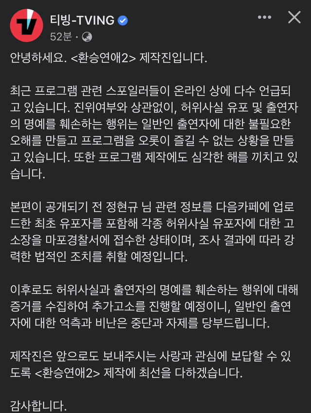 환승연애2 제작진은 "본편이 공개되기 전 정현규 님 관련 정보를 업로드한 최초 유포자를 포함해 각종 허위사실 유포자에 대한 고소장은 접수한 상태이며, 조사 결과에 따라 강력한 법적인 조치를 취할 예정"이라고 덧붙였습니다.
