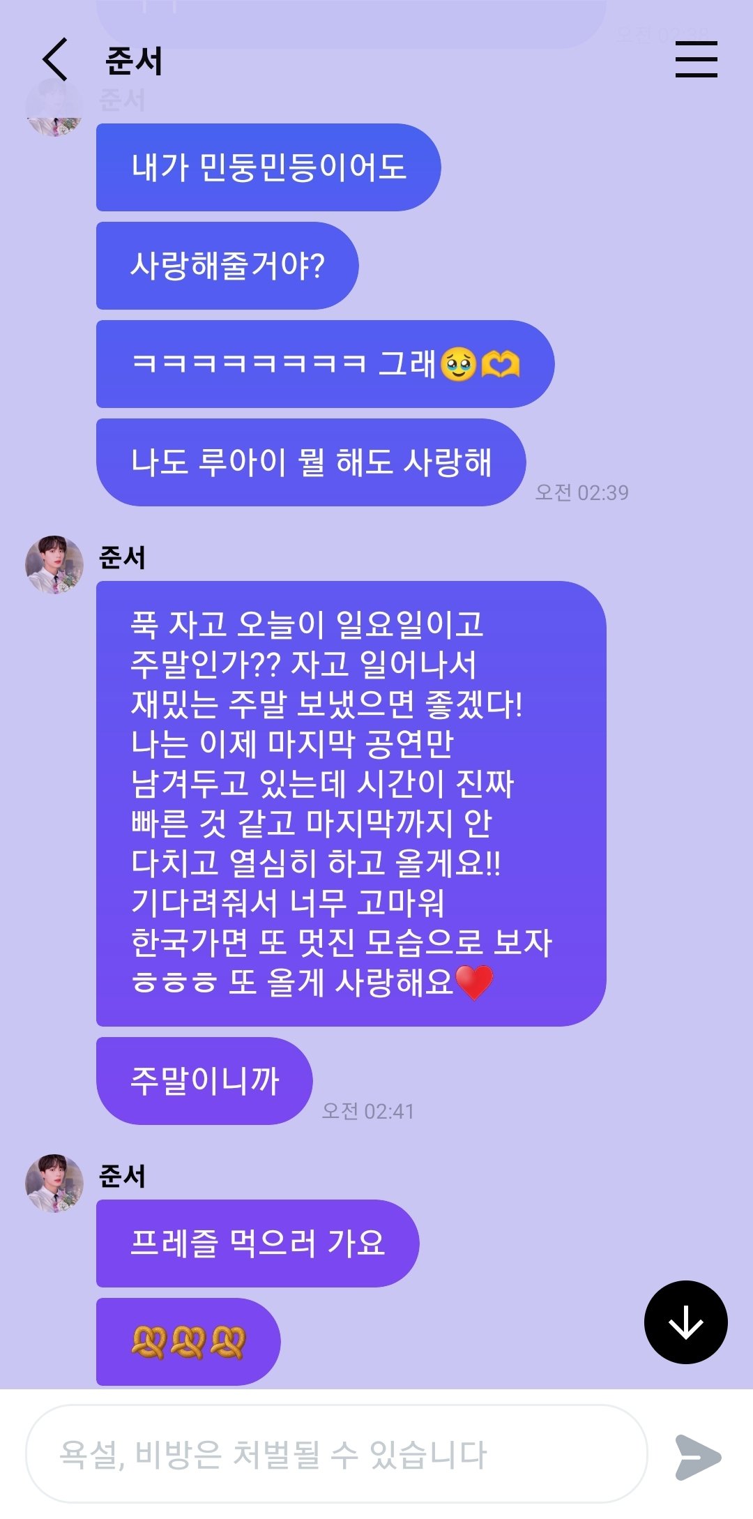 작성자는 준서가 프라이빗 메시지(프메)를 통해 팬들과 소통한 대화 일부를 캡처해 게재했습니다.