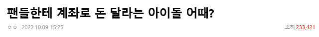 최근 온라인 커뮤니티 네이트판에서는 "팬들한테 계좌로 돈 달라는 아이돌 어때?"라는 게시물이 게재되었습니다.