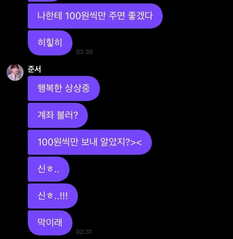 공개된 대화에서 준서는 "나한테 100원씩만 주면 좋겠다", "행복한 상상 중", "계좌 불러?", "ㅅㅎ.. 막이래"라며 장난 멘트를 적었습니다.