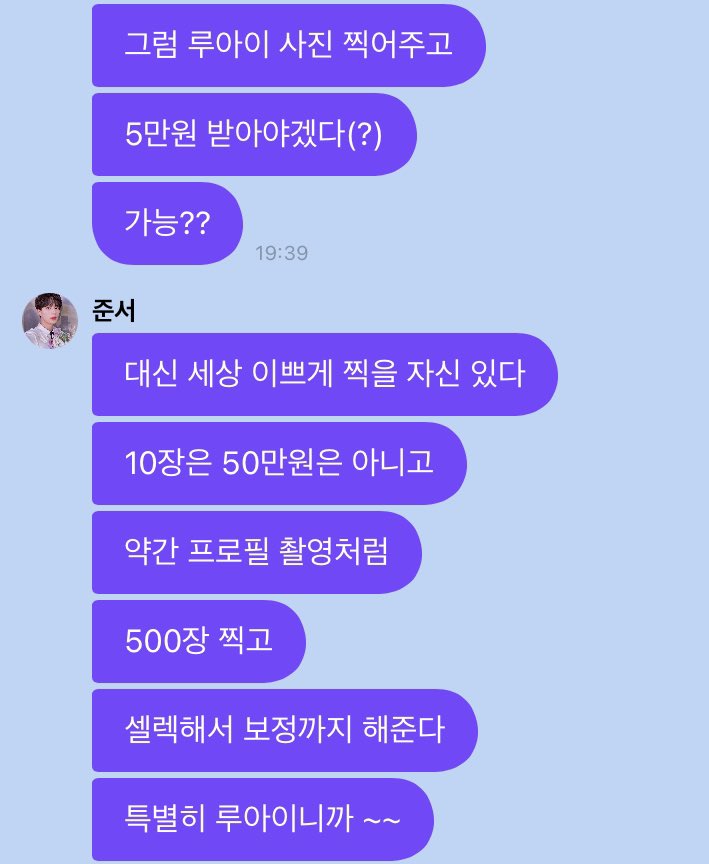 또 "루아이(팬덤명) 사진 찍어주고 5만 원 받아야겠다", "500장 찍고 셀렉해서 보정까지 해준다"라고 말하기도 했습니다.