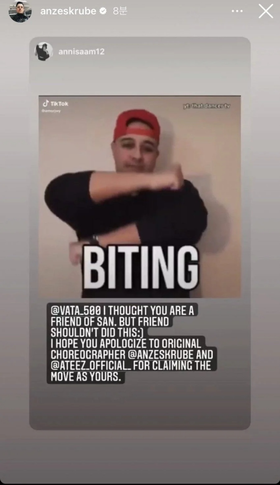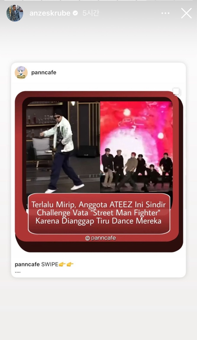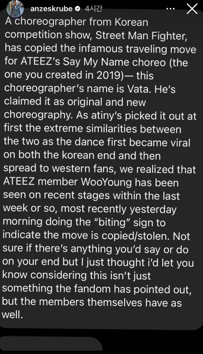 안무가 안제스크루브는 10일 자신의 인스타그램 스토리를 통해 바타가 에이티즈 안무를 표절했다는 내용을 게재했습니다.