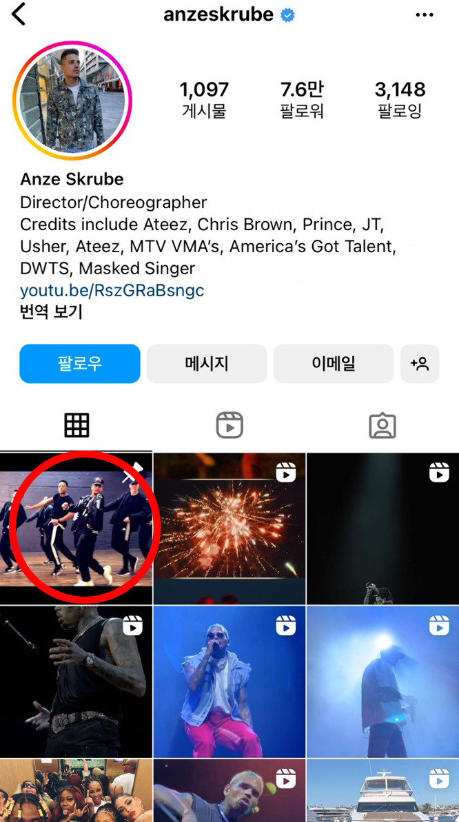 안무가 안제스크루브는 해당 내용뿐만 아니라 지난 2019년 1월 에이티즈의 안무 시안 영상을 인스타그램 계정 상단에 고정했습니다.