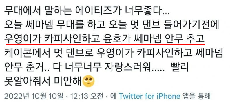 전날엔 에이티즈가 대구에서 진행된 한 콘서트 무대에서 'Say My Name' 무대를 선보였습니다. 멤버 우영은 댄스 브레이크 부분에서 팔을 교차하는 동작을 선보였습니다. 이는 댄서씬에서 유사성을 제기할 때 쓰는 표현으로 이에 네티즌들은 에이티즈 또한 해당 논란을 인지하고 있는 게 아니냐는 추측을 보였습니다.