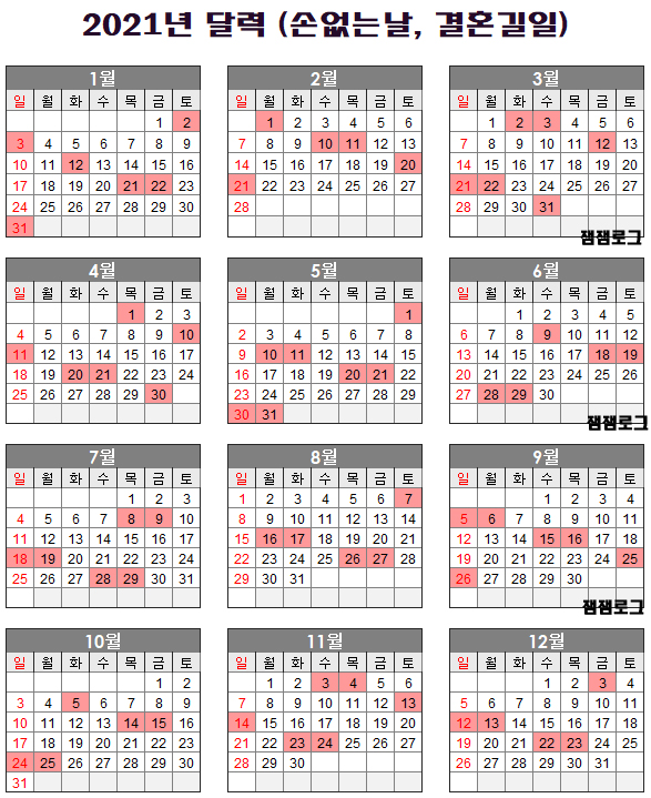 2021년 달력을 보면 2021년 손 없는 날의 경우 한 달에 5~6일 정도가있네요. 결혼식은 보통 주말에 하기때문에 2021년 손없는날의 주말을 살펴보겠습니다.