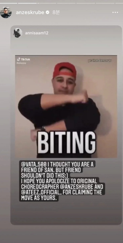 에이티즈의 'Say My Name' 안무 원작자인 안제 스르루브는 인스타그램에 바타가 에이티즈의 안무를 표절했다는 내용을 올리기도 했습니다.