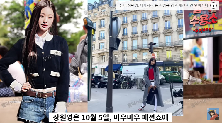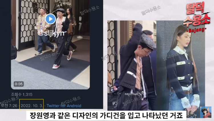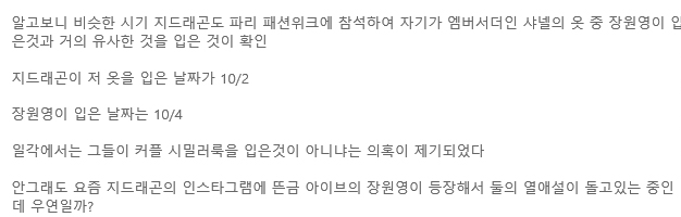 이어 "알고 보니 비슷한 시기 지드래곤도 파리 패션위크에 참석하여 본인이 엠베서더인 샤넬의 옷 중 장원영이 입은 것과 유사한 것을 입은 것이 확인됐다"며 "지드래곤은 10월 2일, 장원영은 10월 4일 그들이 커플 시밀러룩을 입은 것이 아니냐는 의혹이 제기되었다"고 주장했습니다.
