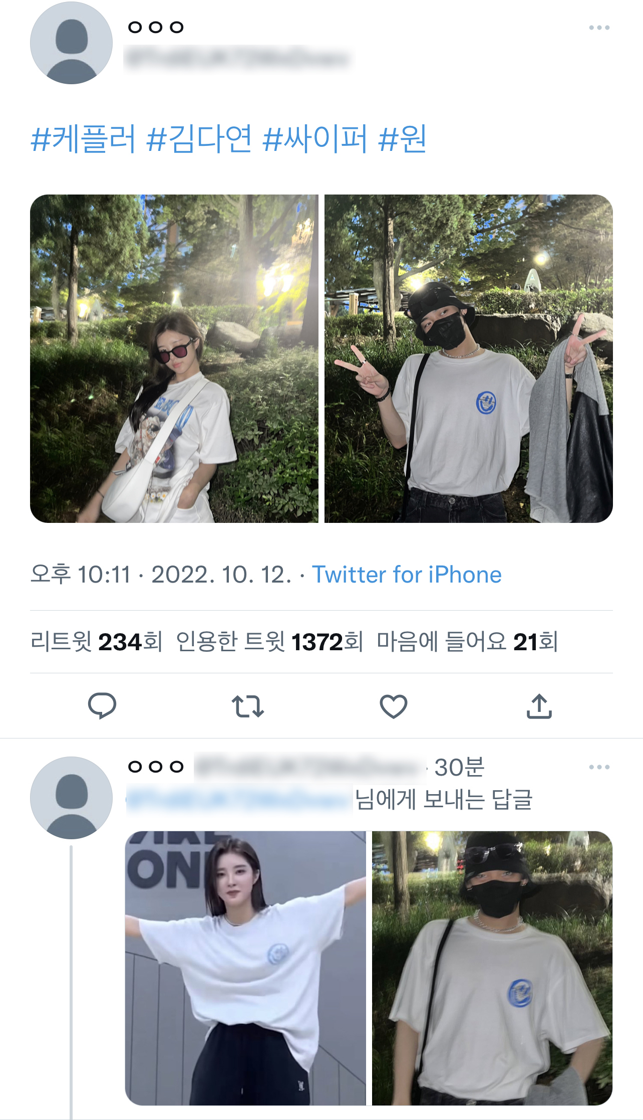 사진 속 원은 공원으로 추정되는 곳에서 포즈를 취하고 있는데, 해당 장소와 매우 흡사해 보이는 배경과 시간대에 케플러 멤버 김다연 역시 찍은 사진이 있었습니다.