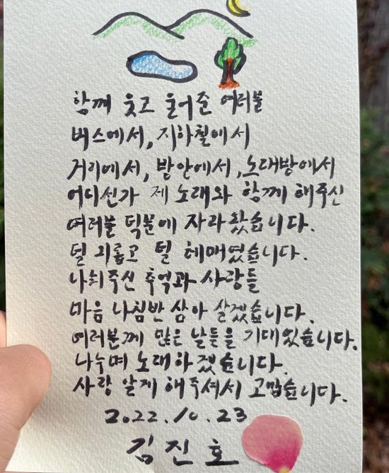 지난 7월 결혼을 발표한 김진호는 "이제 새로운 가족사진을 찍으려 한다. '너를 안으면 나를 안아주는 것 같다'는 이 감정을 서로 나눌 수 있는 상대와 결혼한다"면서 "잘 살겠다. 그리고 이 안에서 피어날 새로운 삶을 또 노래하겠다"고 소감을 밝혔습니다.