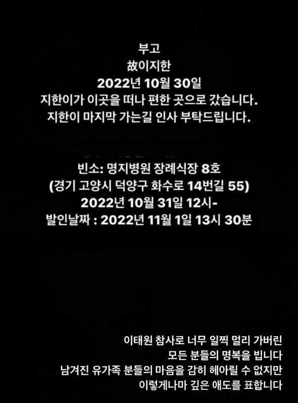 갑작스러운 비보에 소속사 관계자들은 슬픔을 금치 못하고 있는 것으로 전해졌습니다. 이지한의 빈소는 31일 오후 12시쯤 명지병원 장례식장 8호실에 차려질 예정으로 발인은 11월 1일인 것으로 알려졌습니다.