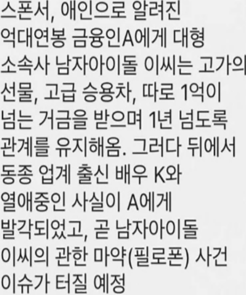 찌라시 내용에 따르면 스폰서, 애인으로 알려진 억대 연봉 금융인 A에게 대형 소속사 남자 아이돌 이씨는 고가의 선물, 고급 승용차, 따로 1억이 넘는 거금을 받으며 1년 넘도록 관계를 유지해왔고 그러다 뒤에서 동종 업계 출신 배우 K와 열애 중인 사실이 A에게 발각되었다고 합니다.