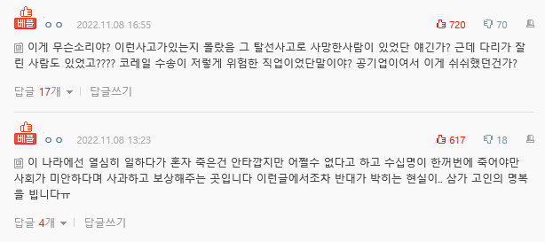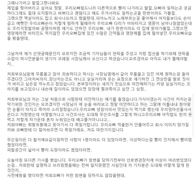 A 씨는 이어 "저 많은 열차를 단 2명이서 그것도 숙련된 2명도 아닌 입사한 지 얼마 안 된 인원들 포함 2명이서 그 일을 ㅎ나다고 들었다"며 "우리 오빠 안 억울할 수 있게 많은 분들이 이 사건에 대해 인지해주시고 알려주셨으면 좋겠다"라고 토로했습니다.