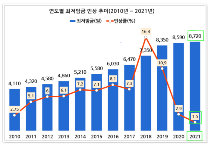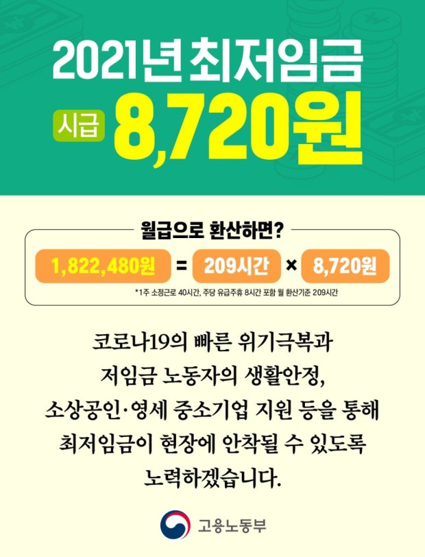 2021년 최저임금(최저시급)은 8,720원 입니다. 최저임금은 근로자의 생계비, 임금 수준 등의 고용 상황과 물가상승률, 경제성장 등의 경제 상황을 고려하여 직전 연도 8월 5일 이전까지 결정되어 다음해 1월 1일부터 12월 21일까지 적용됩니다. 올해는 코로나19 사태로 인해 경영난을 겪고 있는 기업과 자영업자들의 상황을 고려하여 민생안정을 위해 1988년 최저임금제도 첫 시행 이후 가장 낮은 인상률 1.5%를 기록했습니다.