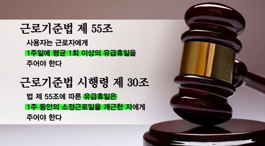 사용자는 일주일 동안 소정의 근로일수를 개근한 노동자에게 1주일에 평균 1회 이상의 유급휴일을 주어야합니다