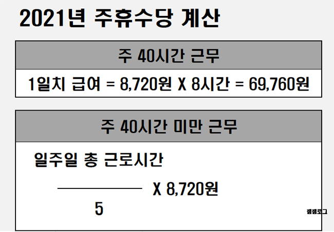 주휴수당 = 1일치 급여 = 8,720원 X 8시간 = 69,760원