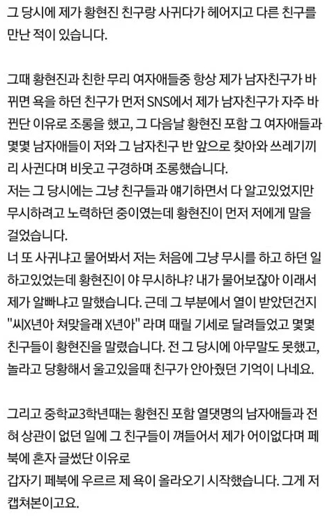 A 씨는 "당시 저는 작은 회사에 소속돼 연기를 배우며 촬영을 다녔던 이력이 있었다. 주변 친구들에게는 일을 한다는 이야기는 하지 않았다"며 "제가 이러한 일을 한다는 것을 알게 된 황현진은 '어느 회사냐', '무슨 촬영이냐' 등 캐묻기 시작했고 저에게 '너보다 내가 먼저 데뷔 할거다'라며 원인 모를 언어폭력을 당했다"고 주장했습니다.