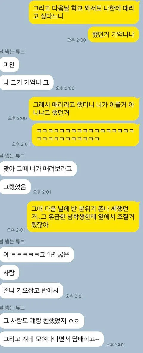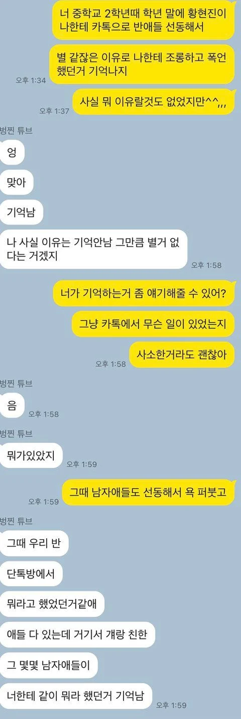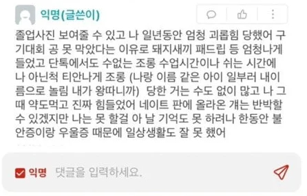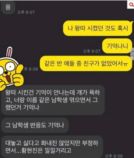 추가 폭로자는 "축구공을 막지 못했다는 이유로 저는 왕따가 되었고 그 이후에도 황현진에게 많은 조롱과 무시, 괴롭힘을 받았다"며 "단톡방에 수도 없이 언급을 하며 제 이름을 걸면서 애들한테 장난을 쳤다"라고 주장했습니다.