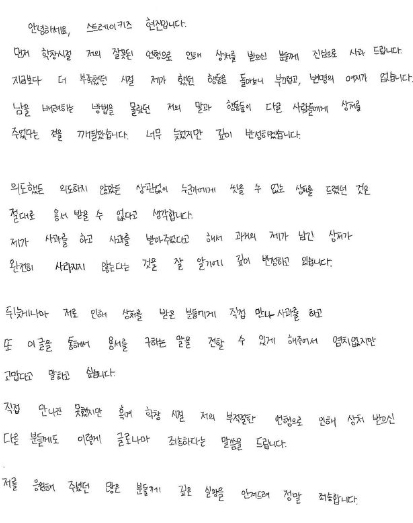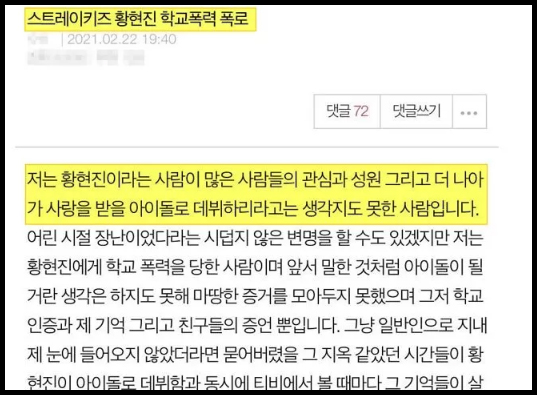 이후 현진은 스트레이 키즈 공식 SNS에 자필 사과문을 올리고 "학창 시절 저의 잘못된 언행으로 인해 상처를 받으신 분들에게 진심으로 사과드린다. 지금보다 더 부족했던 시절 제가 했던 행동을 돌아보니 부끄럽고 변명의 여지가 없다"라고 고개를 숙였습니다.