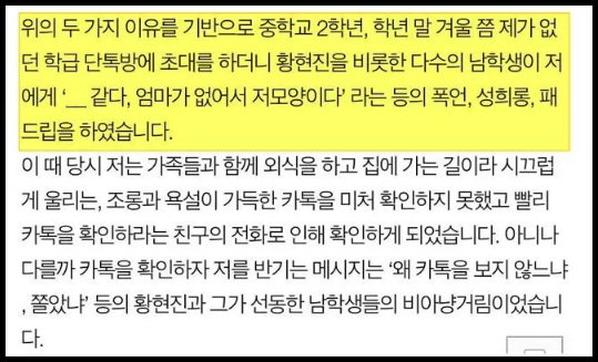 특히 그는 학급 단톡방에 초대를 받은 뒤 현진을 비롯한 다수의 남학생으로부터 '엄마가 없어서 저 모양이다'등의 폭언과 성희롱, 패드립을 들었다고도 밝혀 충격을 주었습니다.