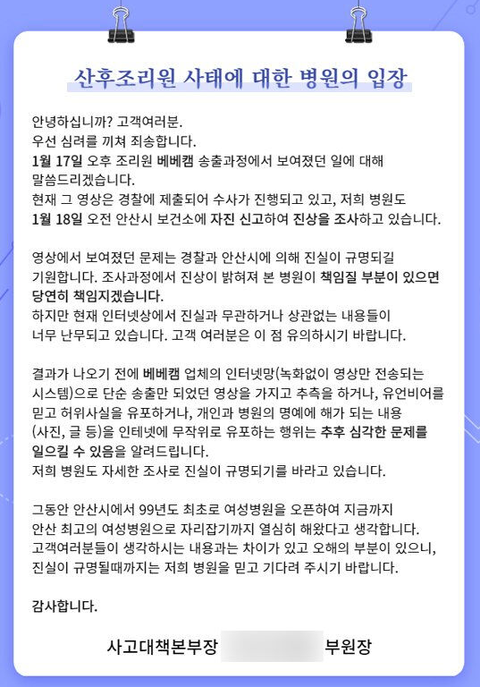 산후조리원은 이날 낸 입장문에서 "영상은 경찰에 제출돼 수사가 진행되고 있고 병원도 오늘 오전 안산시 보건소에 자신 신고해 진상을 조사하고 있다"며 "조사 과정에서 진상이 밝혀져 본 병원에서 책임질 부분이 생긴다면 당연히 책임을 지겠다"라고 밝혔습니다.