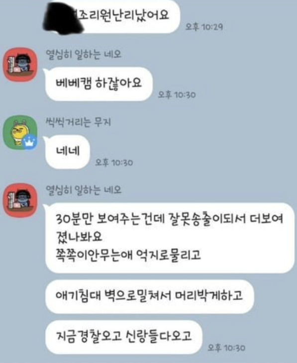 한편 이 안산시 산후조리원에 입소한 부모들은 카카오톡 단체 대화방과 맘카페 등을 통해 자신이 베베캠으로 본 내용을 공유하고 있습니다.