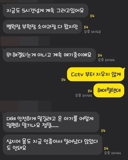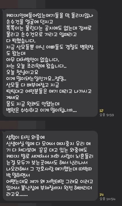 또 다른 부모는 "직원이 케이키 안에 있는 아기들을 막 돌리고 손수건을 얼굴에 던졌다. 또 쪽쪽이를 강제로 물리고 입을 떄리는것도 다 찍혔다"며 "병원장도 왔는데 아무 대처 방안이 없다. 나는 오늘 조리원에 왔는데 이게 말이 되는 일인가"라고 글을 남겼습니다.