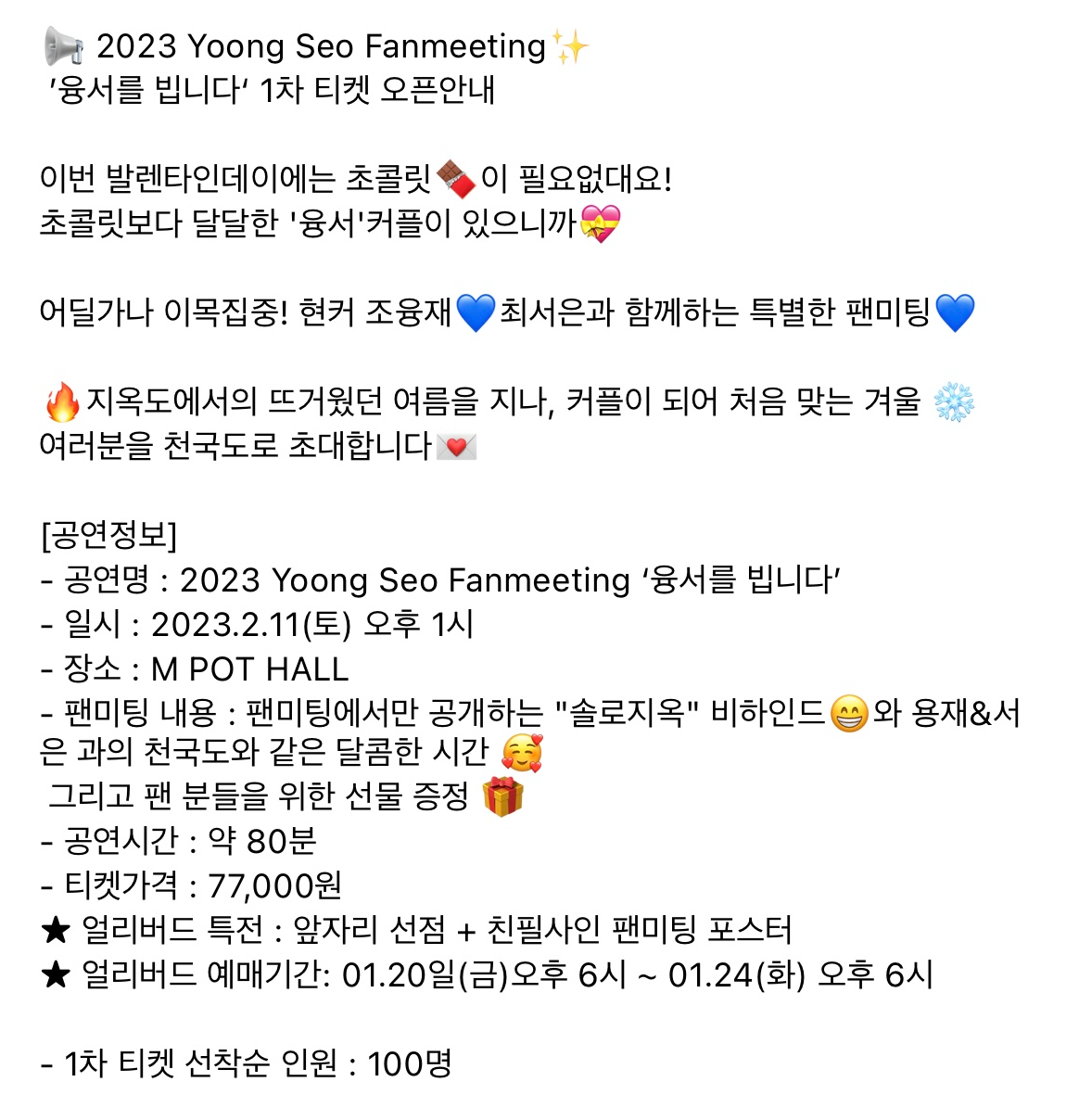 조융재 최서은은 오는 11일 오후 1시 커플 팬미팅 2023 Yoong Seo Fanmeeting '융서를 빕니다' 개최를 알렸는데요. 이들은 팬미팅을 통해 팬미팅에서만 공개하는 '솔로지옥2' 비하인드와 팬을 위한 선물증정, 그리고 달콤한 시간을 보낼 것이라고 소개했습니다.