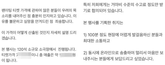 해명에서 팬들에게 줄 기프트 제작비가 팬미팅 가격에 포함되어 있다는 점. 소극장 대관비와 인건비를 제외해도 비싸게 가격이 책정됐다는 점에서였습니다.