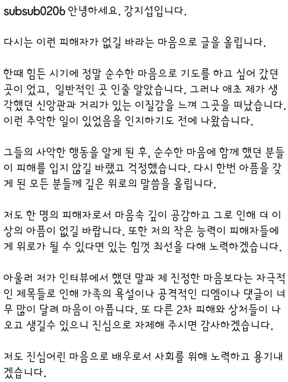 지난 12일 배우 강지섭은 자신의 인스타그램에 장문의 글을 올리며 "다시는 이런 피해자가 없길 바라는 마음으로 글을 올린다"며 "애초 제가 생각했던 신앙관과 거리가 있는 이질감을 느껴 그곳을 떠났다. 이런 추악한 일이 있었음을 인지하기도 전에 나왔다"고 주장했습니다.