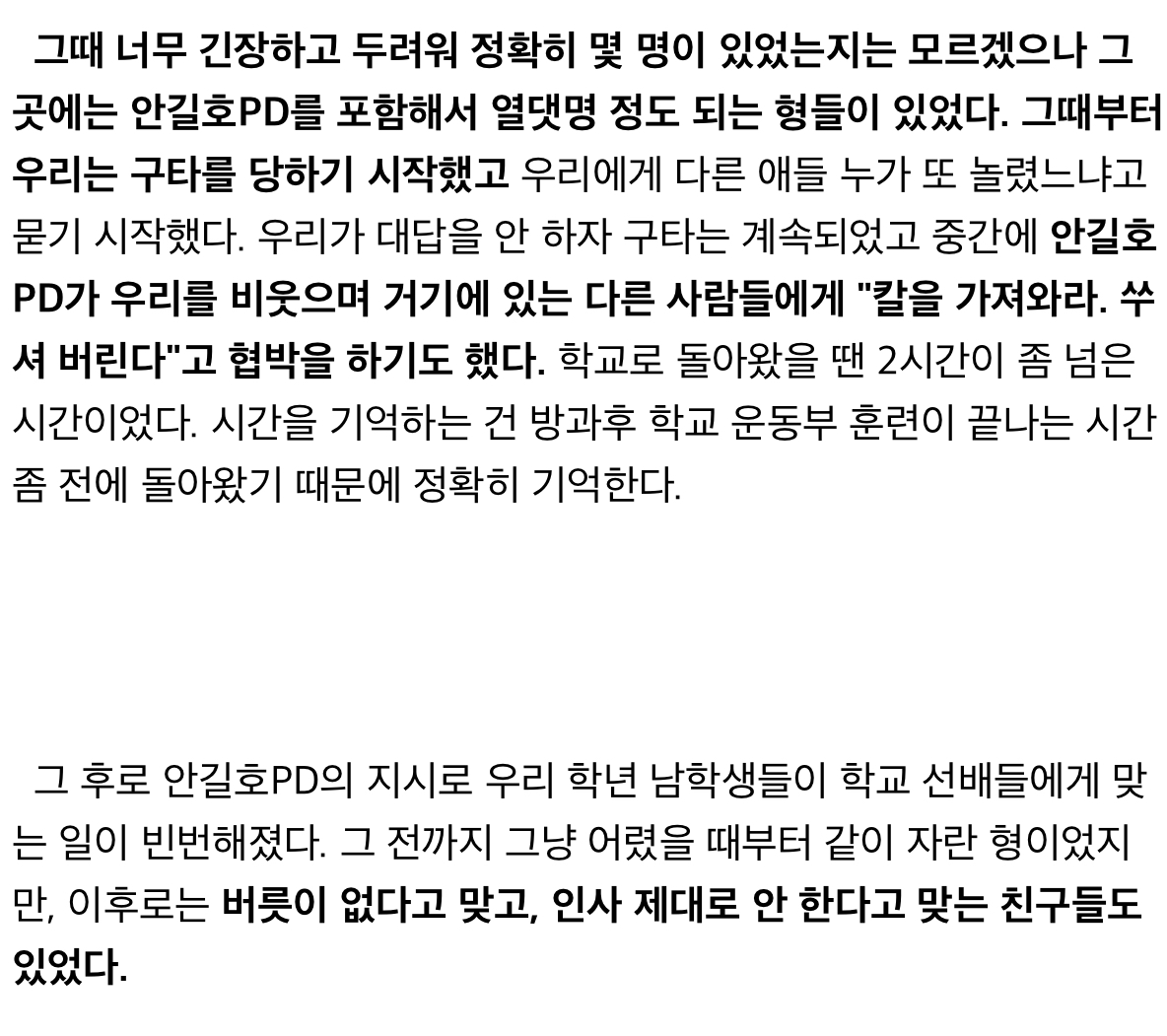 그는 "안길호 PD를 포함해 열댓 명 정도 되는 형들이 있었다. 그때부터 구타당하기 시작했다"며 "'칼을 가져와라' 'X셔 버린다'고 협박하기도 했다"고 말했습니다.