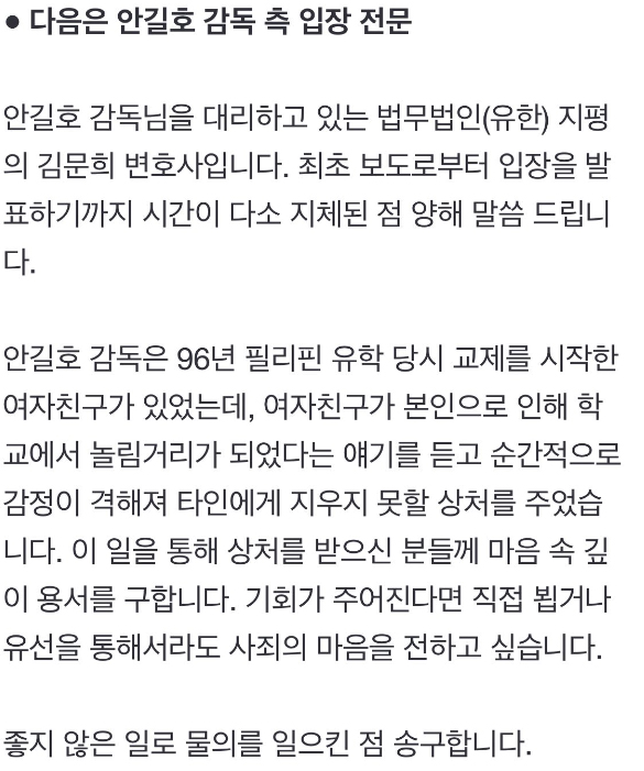 안길호 PD는 "96년 필리핀 유학 당시 교제를 시작한 여자친구가 있었는데 여자친구가 본인으로 인해 학교에서 놀림거리가 되었다는 얘기를 듣고 순간적으로 감정이 격해서 타인에게 지우지 못할 상처를 주었다"며 "상처를 받으신 분들께 용서를 구한다. 기회가 주어진다면 직접 뵙거나 유선을 통해서 사죄의 마음을 전하고 싶다"고 밝혔습니다.