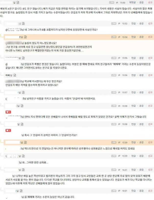 이 가운데 또 다른 커뮤니티에는 A씨의 친구라는 C씨가 등장해 관련 의혹을 언급했습니다. C씨는 "기사 내용은 사실"이라며 "놀림 정도가 이름을 가지고 놀리는 수준이었다. 안 PD의 지시로 저희 학년은 거의 다 선배들에게 맞았다"고 말했습니다.