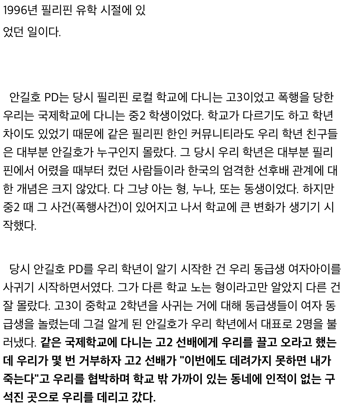 10일 한일 커뮤니티 사이트에는 1996년 필리핀에서 안길호 PD로부터 폭행당했다는 A씨의 글이 게재되었습니다.